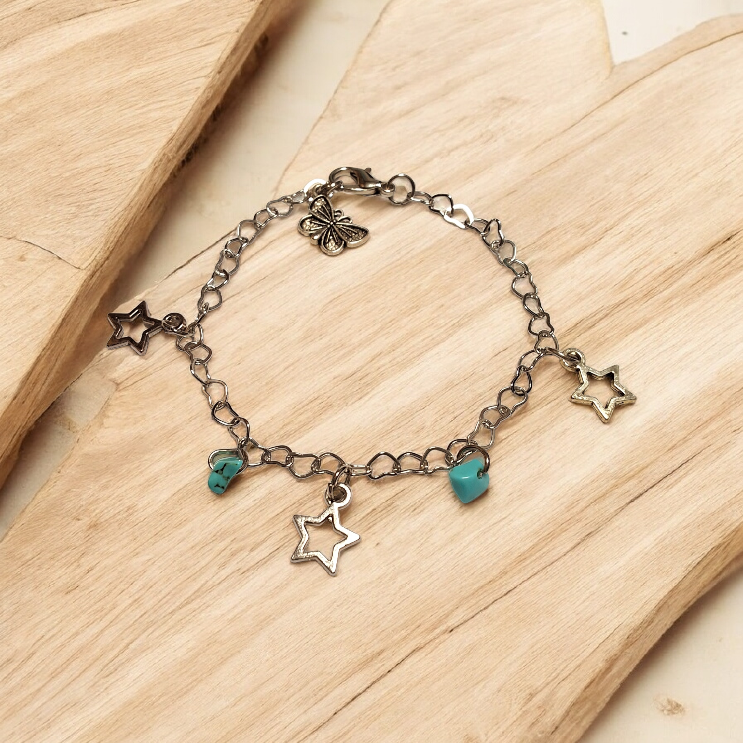 أسوارة بتصميم يدوي تجمع بين العفوية والأناقة، تتزين بتعليقات على شكل نجوم تتناغم مع الأحجار الفيروزية لتمنح القطعة حركة جذابة ولمسة لونية منعشة. تصميمها الخفيف والمميز يجعلها خيارًا مثالياً لمن تبحث عن إكسسوار مختلف يبرز شخصيتها ويضيف طابعًا عصريًا للإطلالة. مقدمة لكم من (Maram Bracelet)🌷