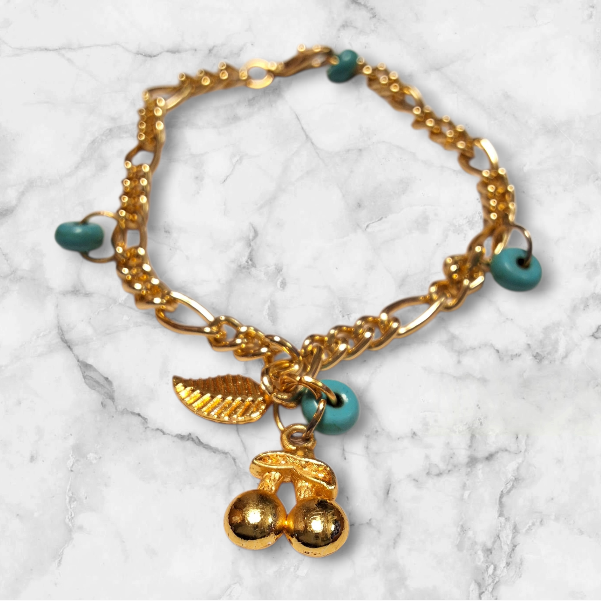 أسوارة مشغولة يدوياً بتصميم يفيض بالأنوثة يجمع بين بريق السلسلة الذهبية بنمط الجنزير المتداخل وسحر القلادات المتدلية بشكل كرز وورقة شجر مذهبة وتتوزع عليها حبات من الخرز الفيروزي الصغير التي تضفي تبياناً لونياً جذاباً والقطعة مصممة لتكون لمسة جمالية لافتة لمعصمك أو تقدميها كهدية رقيقة تفيض بالبهجة لمن تحبين لتبقى ذكرى جميلة تدوم طويلاً.مقدمة لكم من (Maram Bracelet)🌹