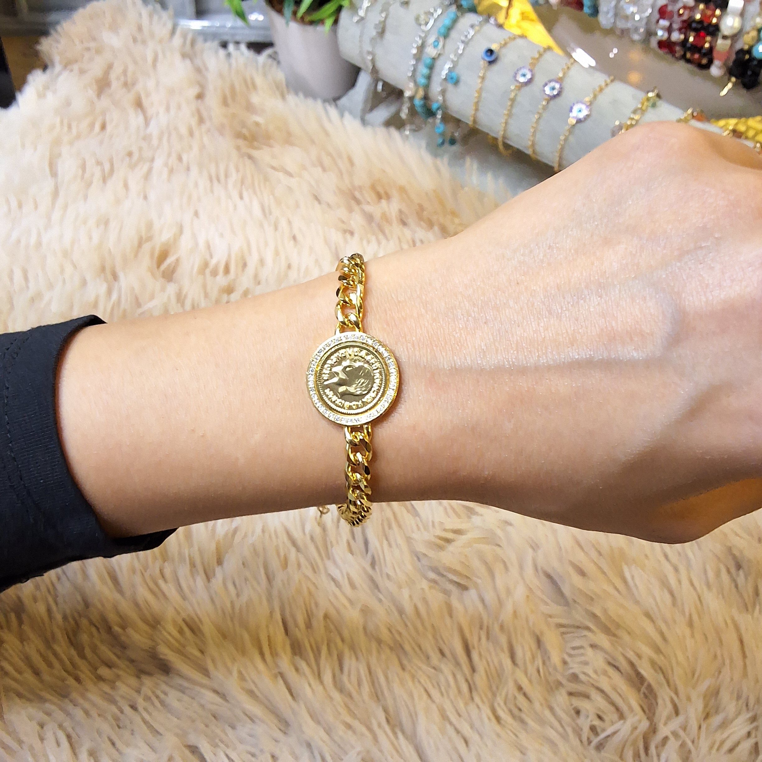 أضيفي لمسة من الفخامة الكلاسيكية إلى معصمك مع هذه الأسوارة الذهبية الأنيقة المصممة بنمط الجنزير المتداخل. تتميز الأسوارة بتوسطها تعليقة ليرة ذهبية محاطة بإطار من فصوص الزركون اللامعة التي تضفي بريقاً لافتاً مع كل حركة. مقدمة لكم من (Maram Bracelet)🌷
