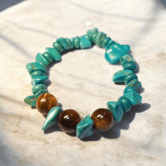 يتميّز سوار فيروز وعين النمر نسائي بتناسق لافت بين لون الفيروز الهادئ ولمعان عين النمر الدافئ، ليمنح إطلالتك لمسة طبيعية أنيقة. الخيط المطاطي يجعله سهل الارتداء ومريحًا طوال اليوم، ما يجعله خيارًا مثاليًا للمرأة التي تبحث عن الأناقة والبساطة في آنٍ واحد. مقدمة لكم من (Maram Bracelet) 🌷