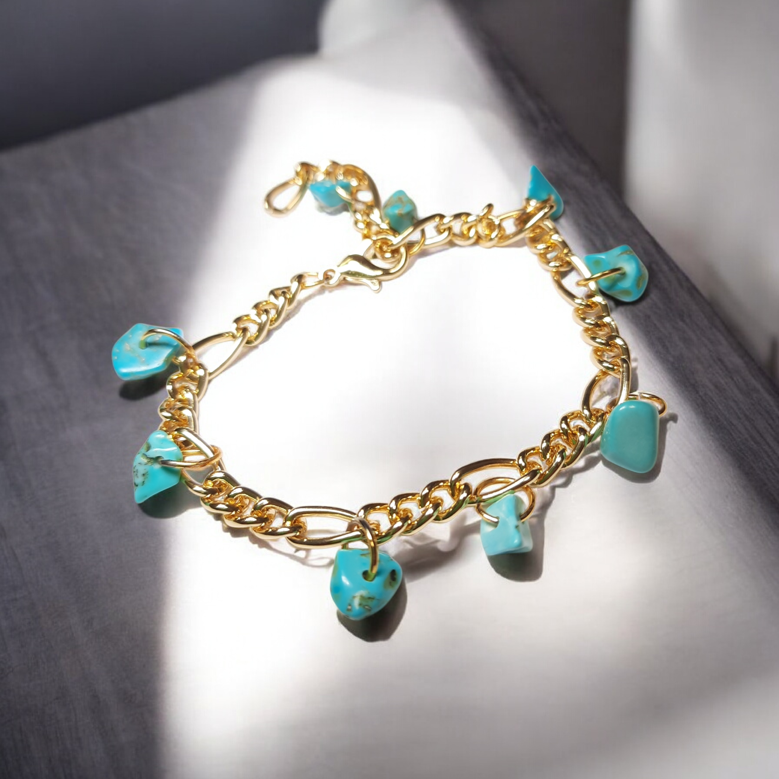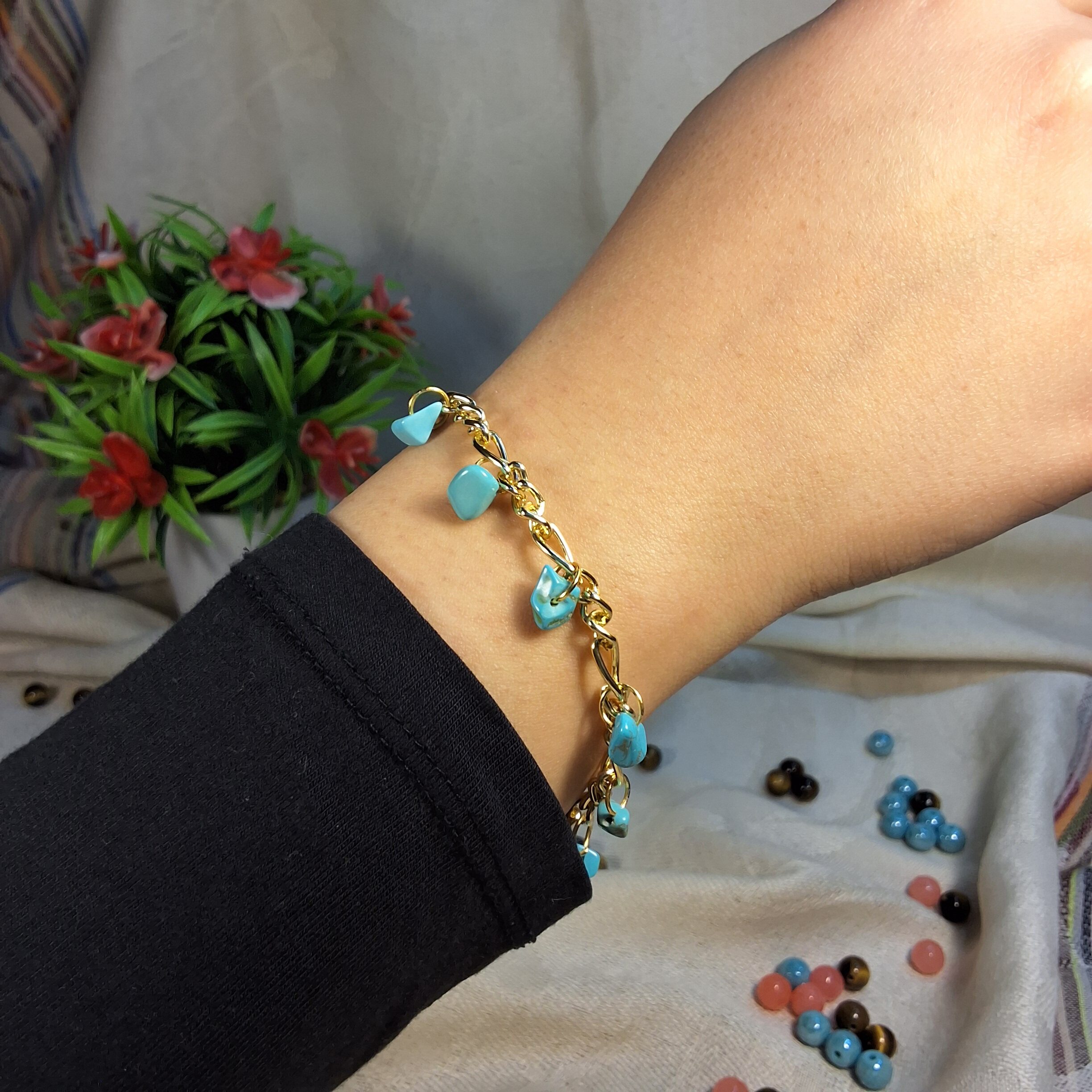 سوار مشغول بعناية وبأسلوب يدوي واضح، يعتمد على سلسلة ذهبية بلون دافئ تتدلّى منها قطع فيروزية مصقولة بعناية لتمنح حركة خفيفة ولمسة فنية مريحة للعين. مقدمة لكم من (Maram Bracelet)🌹