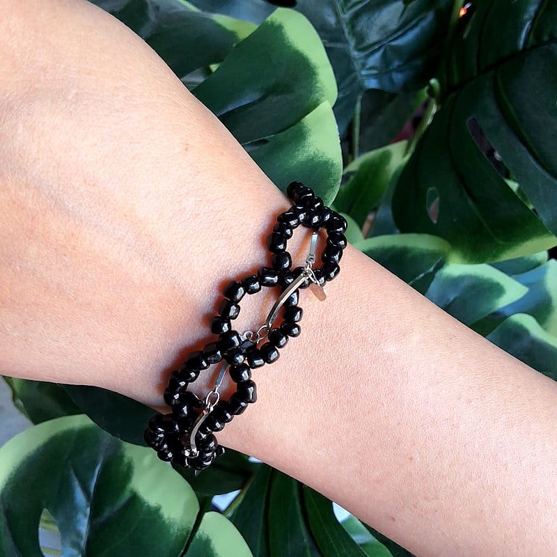 أسوارة خرز أسود بتصميم مميز من حلقات متداخلة تمنحك إطلالة عصرية وأنيقة بلمسة فخمة. شكلها الفريد يلفت الأنظار ويضيف لمسة مختلفة تناسب الإطلالات اليومية والمناسبات، كما أنها خيار رائع لهدية مميزة تعكس ذوقاً راقياً. مشغولة باليد بعناية ✨ بتفاصيل دقيقة تعكس الذوق الفني وتمنحك قطعة فريدة لا تشبه غيرها. مقدمة لكم من (Maram Bracelet)🌷