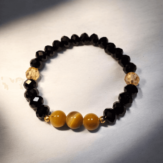تتميز أسوارة الخرز الأسود مع حجر عين النمر بتباين أنيق بين لون الخرز الأسود ولمعان عين النمر الدافئ، ما يمنحه مظهرًا مرتبًا وواضحًا دون مبالغة. اللمسات الذهبية الصغيرة تضيف تفصيلاً بسيطًا يكمّل التصميم، ليكون السوار مناسبًا للاستخدام اليومي وسهل التنسيق مع مختلف الأزياء.