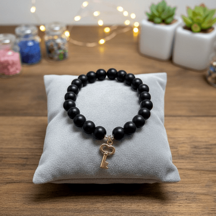 أسوارة مشغولة يدوياً بفخامة اللون الأسود الملكي الذي يمنحه خرز الأونيكس المطفي وتتوسطه قلادة ذهبية دقيقة على شكل مفتاح بلمسة فنية متميزة والقطعة تجسد التوازن بين البساطة والأناقة مما يجعلها خياراً رائعاً لتدللي بها نفسك أو تقدميها كهدية استثنائية لمن تحبين لتبقى ذكرى غالية تدوم طويلاً. مقدمة لكم من (Maram Bracelet)🌷