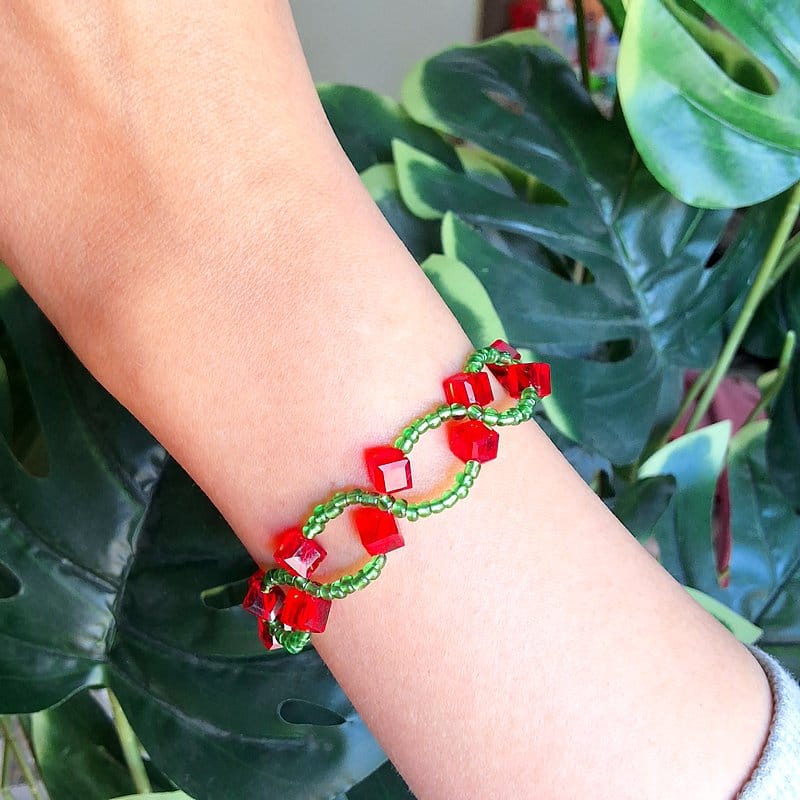أسوارة خرز بتصميم مميز تجمع بين اللونين الأحمر والأخضر مع تفاصيل مكعبات لامعة تضيف لمسة حيوية وجذابة. تصميمها المختلف يعطي طابع مرح وأنيق في نفس الوقت، ويبرز جمال اليد بطريقة ملفتة، مما يجعلها مناسبة للإطلالات اليومية والمناسبات. قطعة مشغولة باليد بعناية لتقدم لك تفاصيل مرتبة وجودة جميلة. مقدمة لكم من (Maram Bracelet)🌷