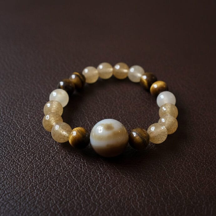 استمتعي بسحر التفاصيل الطبيعية مع أسوارة مشغولة يدوياً تدمج أحجار العقيق المنقوشة بظلالها الدافئة مع حبات عين النمر المموجة، تتوسطها حبة عقيق كبيرة وفريدة لتمنح معصمك حضوراً أنيقاً يفيض بالقوة والجمال. مقدمة لكم من (Maram Bracelet)🌷