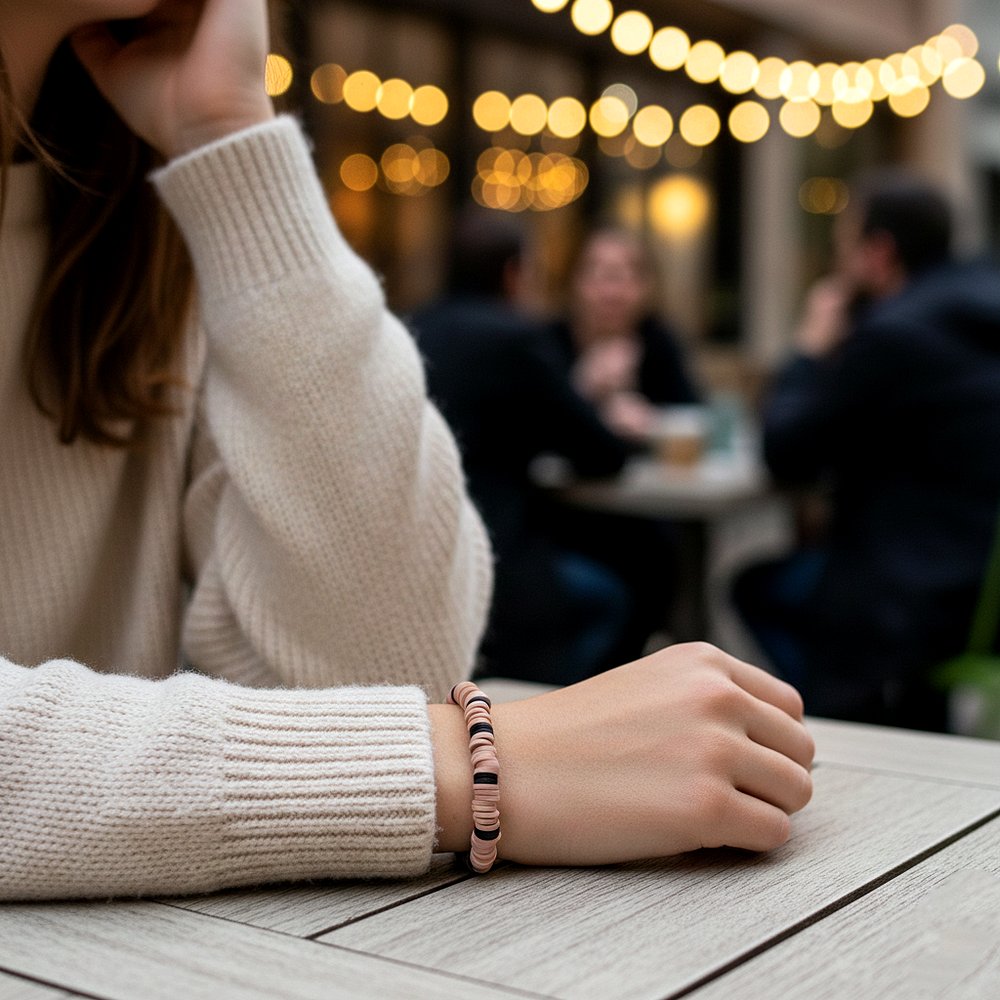 أسوارة مشغولة يدوياً بأسلوب عصري يعتمد على خرز الفيمو المسطح (Flats) بتدرجات لونيّة هادئة تجمع بين اللون اللحمي والأسود والبيج لتمنح معصمك مظهراً ناعماً يتماشى مع ملابسك الشتوية والكاجوال والقطعة مصممة لتكون خفيفة الوزن ومريحة جداً للاستخدام اليومي الطويل بلمسة جمالية بسيطة تفيض بالرقي والهدوء الذي يدوم طويلاً. مقدمة لكم من (Maram Bracelet) 🌹