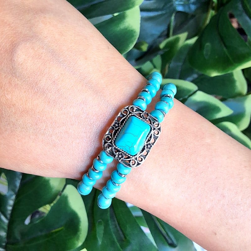 أسوارة خرز بتصميم مميز تتكون من صفين من الخرز باللون الفيروزي مع قطعة وسطية بارزة تعطيها طابع جذاب ولافت. تصميمها الأنيق يضيف لمسة مختلفة لإطلالتك ويبرز جمال اليد بشكل واضح، كما أنها مناسبة للإطلالات اليومية والمناسبات. قطعة مشغولة باليد بعناية لتقدم لك تفاصيل مرتبة وجودة جميلة. مقدمة لكم من (Maram Bracelet)🌷