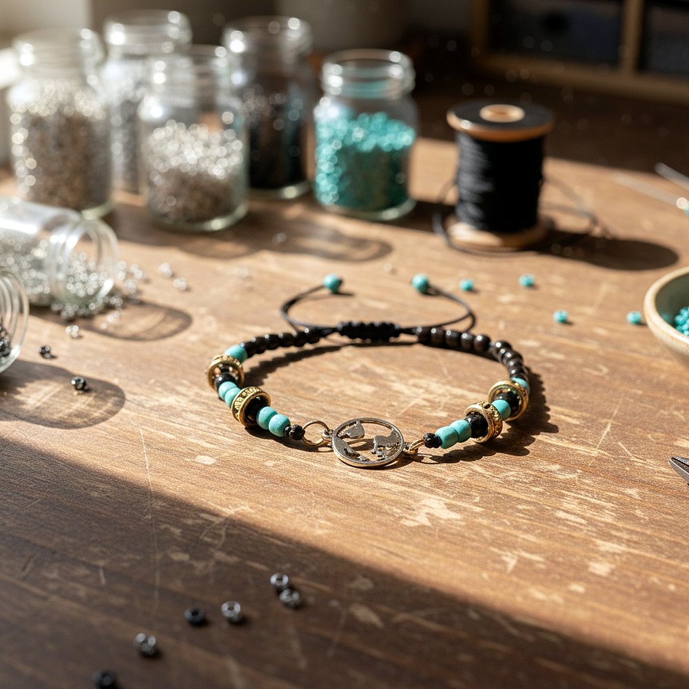 أسوارة مشغولة باليد فريدة تمزج بين أحجار الفيروز السماوي والخرز الأسود الأنيق مع فواصل مزخرفة تتوسطها قلادة فضية معدنية لخريطة العالم بتصميم عصري. مقدمة لكم من (Maram Bracelet) 🌹 القطعة تعبر عن روح المغامرة وحب السفر مما يجعلها هدية استثنائية وملهمة لتعبري بها عن ذوقك الخاص أو لتهديها كذكرى غالية تدوم طويلاً.