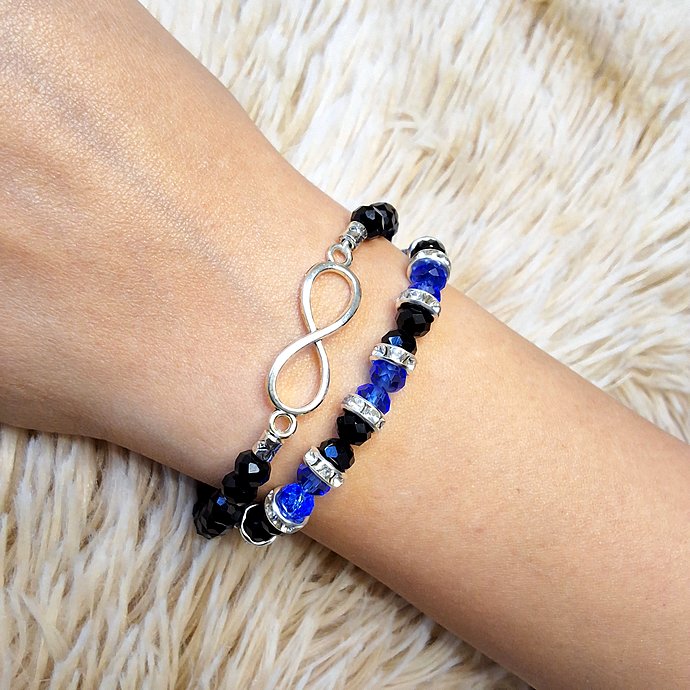 طقم أسوارتين خرز كريستال مضلع باللونين الأزرق والأسود مع تعليقة فضيةجديد