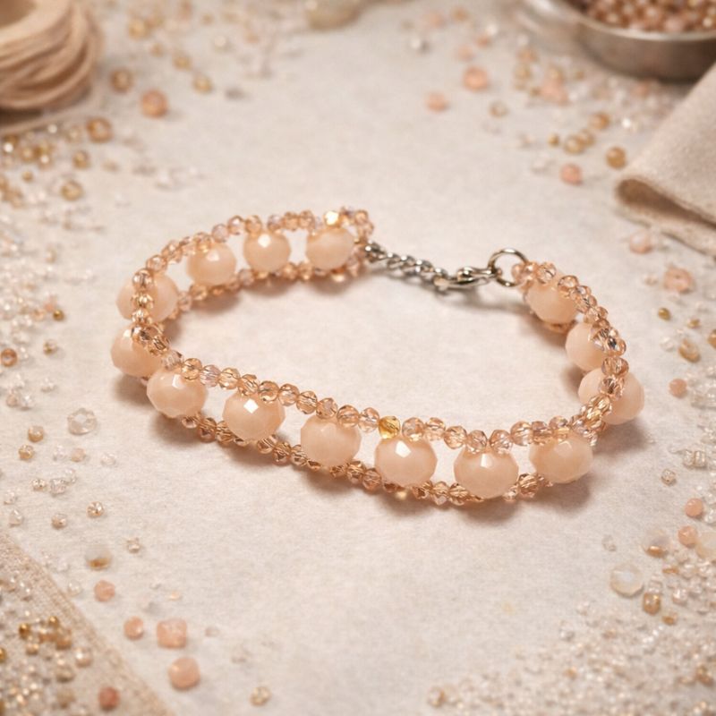 تألقي بنعومة فائقة مع هذه الأسوارة المنسوجة يدوياً، والتي تدمج بين دفء اللون المشمشي للخرز المضلع وبريق الكريستال الزجاجي اللامع الشفاف الناعم. تصميم رقيق يلتف حول معصمكِ ليمنحكِ إشراقة هادئة تناسب كل الأوقات.