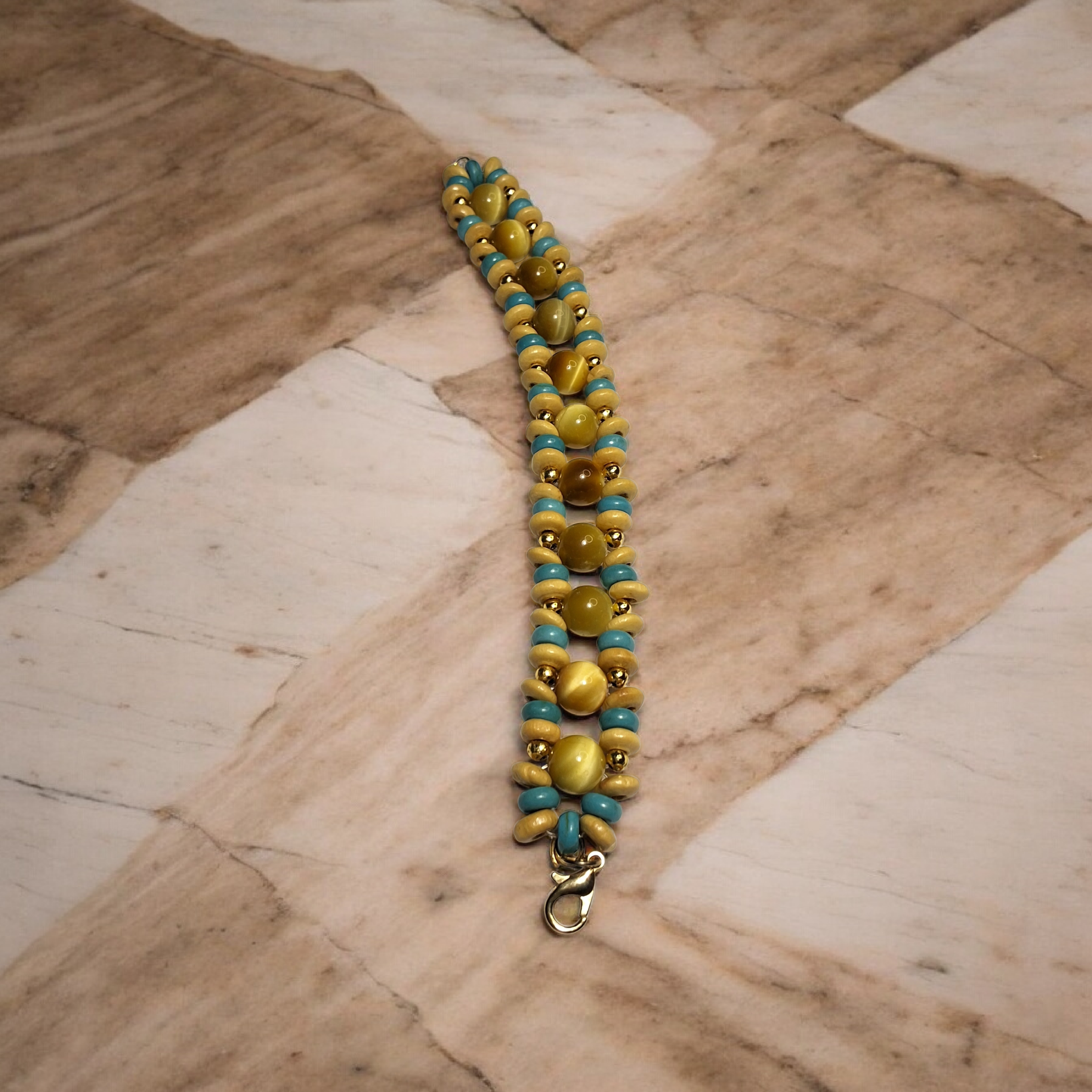 أسوارة نسائية بتصميم متعدد الصفوف من خرز خشبي وفيروزي ومطعم بحجر عين النمر مع لمسات ذهبية، تمنح مظهرًا لافتًا ومناسبًا للإطلالات اليومية. مقدمة لكم من (Maram Bracelet)🌷
