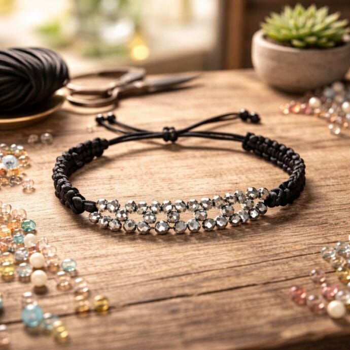 أضيفي لمسة من الغموض والأناقة إلى معصمكِ مع هذه الأسوارة الفريدة التي تجمع بين متانة الخيط الأسود المنسوج وبريق الخرز الفضي اللامع. صُممت هذه الأسوارة لتكون رفيقكِ الدائم، حيث تتميز بنمط “الدرج الهندي” في ترتيب الخرز، مما يمنحه مظهراً عصرياً وقوياً في آن واحد.