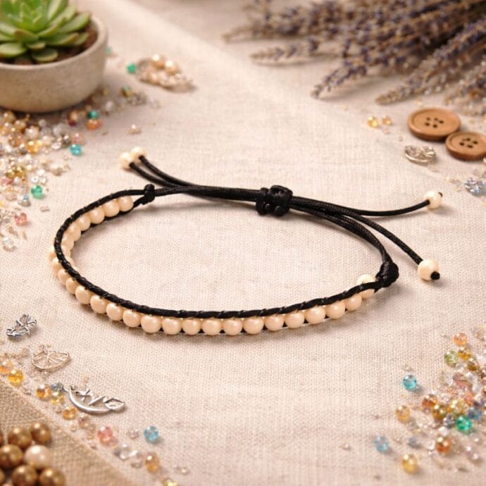 أسوارة نسائية رقيقة بخيط سحب أسود وخرز دائري بلون كريمي ناعم. تصميم بسيط وأنيق يناسب الاستخدام اليومي والهدايا. مقدمة لكم من (Maram Bracelet)🌹