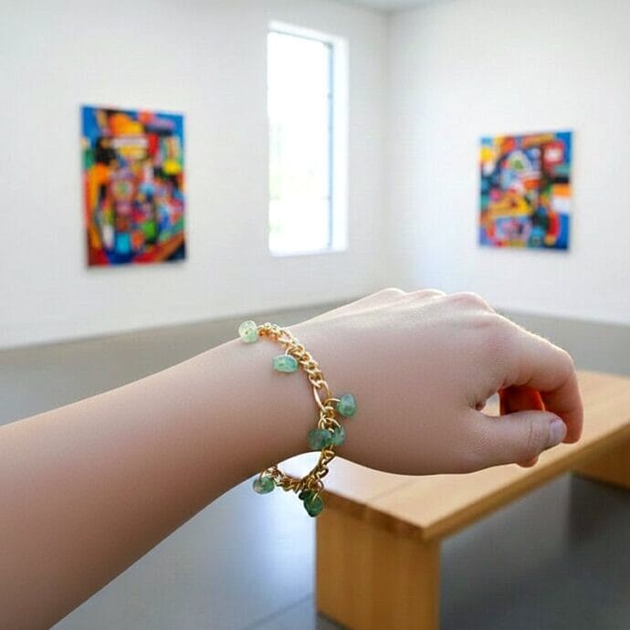 أسوارة مشغولة يدوياً برقة فائقة تجمع بين لمعان السلسلة الذهبية بنمط الحلقات المتصلة وجمال الأحجار الخضراء الطبيعية التي تتدلى كقلادات صغيرة بأشكال عفوية وغير منتظمة والقطعة تعكس مزيجاً رائعاً بين الحداثة وسحر الطبيعة مما يجعلها خياراً رائعاً لتدللي بها معصمك أو تقدميها كهدية رقيقة تفيض بالجمال لتبقى ذكرى جميلة تدوم طويلاً. مقدمة لكم من (Maram Bracelet)🌷