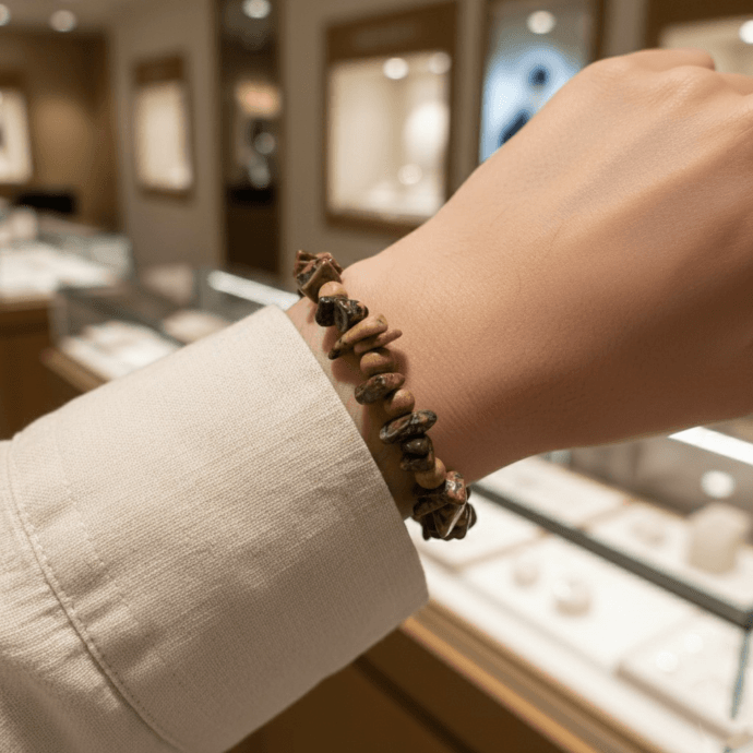 تمتعي بإطلالة طبيعية مستوحاة من ألوان الأرض مع هذه الأسوارة اليدوية الفريدة، التي تدمج أحجار الجاسبر المكسرة بتدرجاتها البنية مع خرز الخشب الناعم، لتمنح معصمك مظهراً دافئاً يفيض بالأصالة والجمال. مقدمة لكم من (Maram Bracelet)🌷