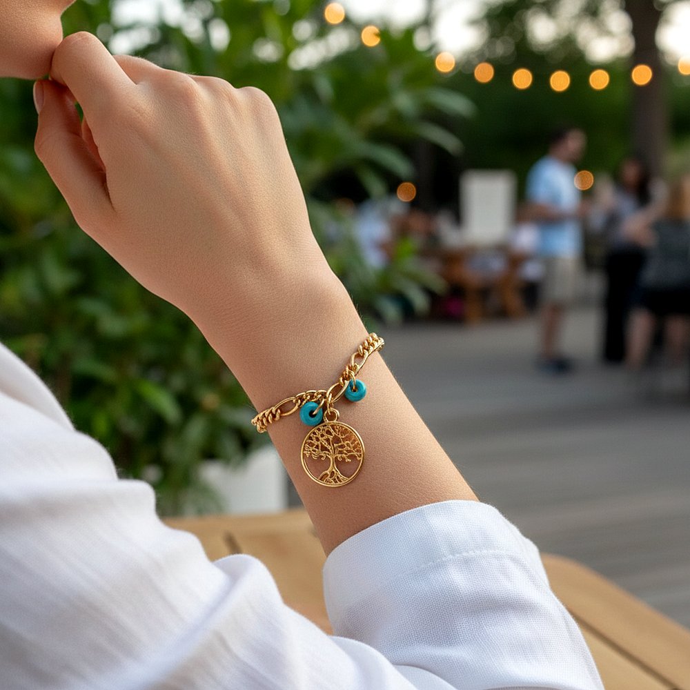 أسوارة نسائية بتصميم سلسلة ذهبية أنيقة، مزوّدة بتعليقة شجرة الحياة وخرز فيروزي صغير، مناسبة للاستخدام اليومي. مقدمة لكم من (Maram Bracelet) 🌷تتميّز هذه الأسوارة بتصميم سلسلة ذهبية يمنحها مظهرًا أنيقًا ومتوازنًا، مع تعليقة شجرة الحياة في المنتصف تضيف تفصيلاً مميزًا دون مبالغة. الخرز الفيروزي الصغير يكمل التصميم بلمسة لونية هادئة، لتكون الأسوارة سهلة التنسيق مع مختلف الإطلالات اليومية والكاجوال.