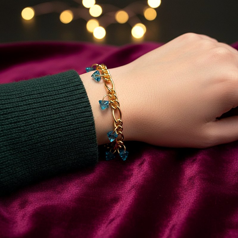 أسوارة مشغولة يدوياً برقة فائقة تجمع بين فخامة السلسلة الذهبية ذات الحلقات العريضة وجمال أحجار الكريستال الطبيعية بلونها الأزرق الصافي التي تتدلى كقلادات صغيرة مقصوصة بشكل هرمي (ماسي) لتعكس الضوء بزوايا متعددة والقطعة تمنح معصمك إشراقة لافتة وتصميماً عصرياً مبهجاً مما يجعلها خياراً رائعاً لتدللي بها نفسك أو تقدميها كهدية رقيقة تفيض بالجمال لتبقى ذكرى جميلة تدوم طويلاً. مقدمة لكم من (Maram Bracelet)🌷
