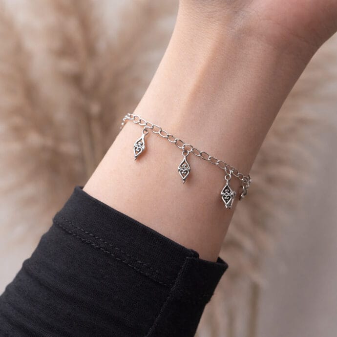 تألقي بجاذبية التصاميم الهندسية مع أسوارة يدوية ناعمة تتميز بسلسلة فضية رقيقة تتدلى منها قلادات على شكل معينات مزخرفة ومنقوشة، لتمنح معصمك لمسة أنثوية راقية تناسب إطلالاتك اليومية بكل بساطة وجمال. مقدمة لكم من (Maram Bracelet)🌷