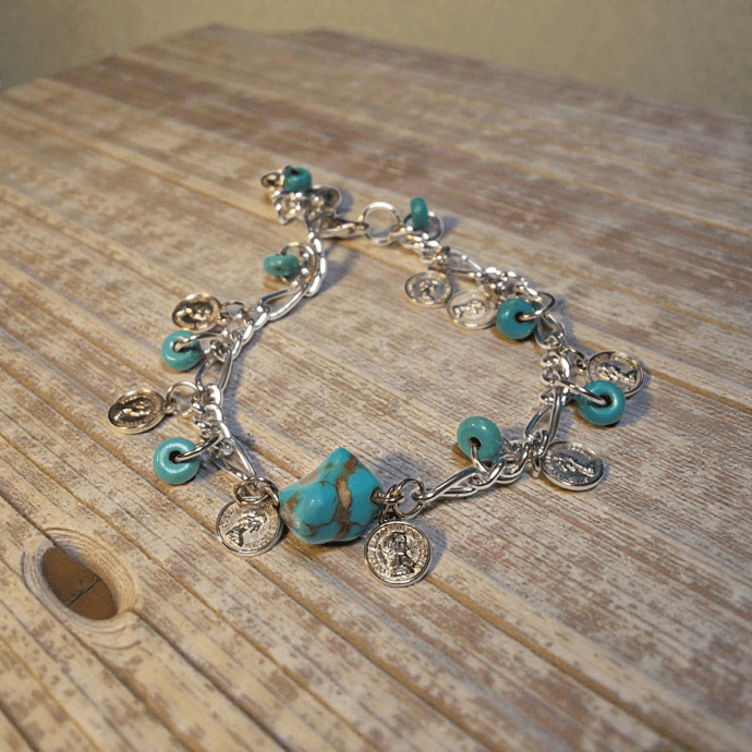 سوار نسائي مميز بتصميم متحرّك يجمع بين السلسلة الفضية اللامعة وتعليقات دائرية باللون الفيروزي مع حجر تركواز مركزي طبيعي، يمنح الإطلالة إحساسًا بالحرية والأنوثة بأسلوب بوهو عصري.