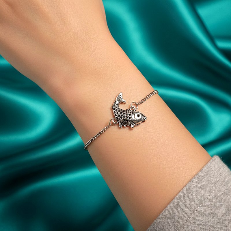 أسوارة مشغولة يدوياً بتصميم يفيض بالبهجة والجمال حيث تتميز بسلسلة فضية ناعمة تبرز في منتصفها قلادة على شكل سمكة مفرغة بدقة بلون الفضة العتيقة ومرصعة بفصوص كريستالية لامعة مقدمة لكم من (Maram Bracelet)🌷والقطعة تعكس ذوقاً رفيعاً وتفاصيل فنية متقنة مما يجعلها خياراً رائعاً لتدللي بها معصمك أو تقدميها كهدية رقيقة تفيض بالجمال لتبقى ذكرى جميلة تدوم طويلاً.