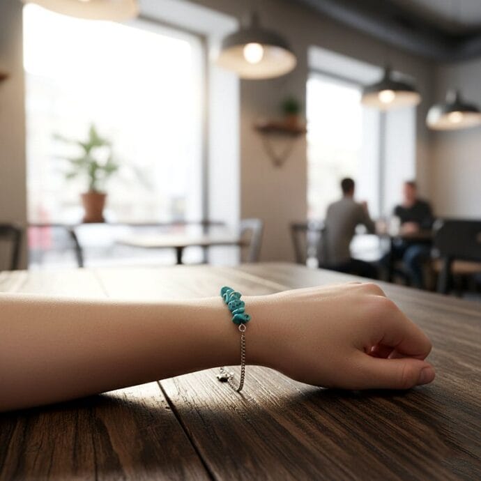أسوارة مشغولة يدوياً بجاذبية لا تقاوم تجمع بين قوة اللون الفيروزي الطبيعي ونعومة السلسلة الفضية حيث تتوسطها أحجار فيروز طبيعية مكسرة بأشكالها الفريدة والقطعة تعكس ذوقاً رفيعاً وتصميماً مبهجاً يضفي حيوية على إطلالتك مما يجعلها خياراً رائعاً لتدللي بها معصمك أو تقدميها كهدية استثنائية تفيض بالجمال لتبقى ذكرى غالية تدوم طويلاً. مقدمة لكم من (Maram Bracelet)🌷