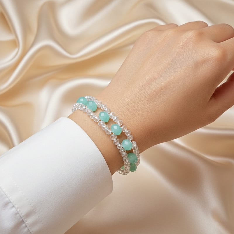 تألقي بتصميم فريد يدمج بين بريق الكريستال الشفاف المضلع وجاذبية الخرز بلونه الأخضر المائي المنعش في أسوارة عريضة مشغولة يدوياً بأسلوب الشبكة، لتمنح معصمك مظهراً ملكياً يفيض بالنعومة والفخامة. مقدمة لكم من (Maram Bracelet)🌷