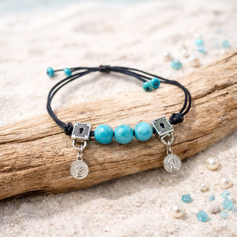 تتميّز هذه الأسوارة بتصميم عملي يجمع بين الخيط القابل للتعديل وحبات الفيروز في المنتصف، ما يوفّر سهولة في الارتداء وراحة طوال اليوم. التعليقات المعدنية تضيف لمسة بسيطة تكمل الشكل العام دون مبالغة، لتكون الأسوارة خيارًا مناسبًا للإطلالات اليومية والكاجوال.