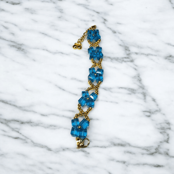 أسوارة نسائية مصنوعة من كريستال أزرق متدرّج مع سلسلة ولمسات ذهبية، بتصميم أنيق يناسب الإطلالات اليومية والمناسبات الخفيفة. مقدمة لكم من (Maram Bracelet)🌷