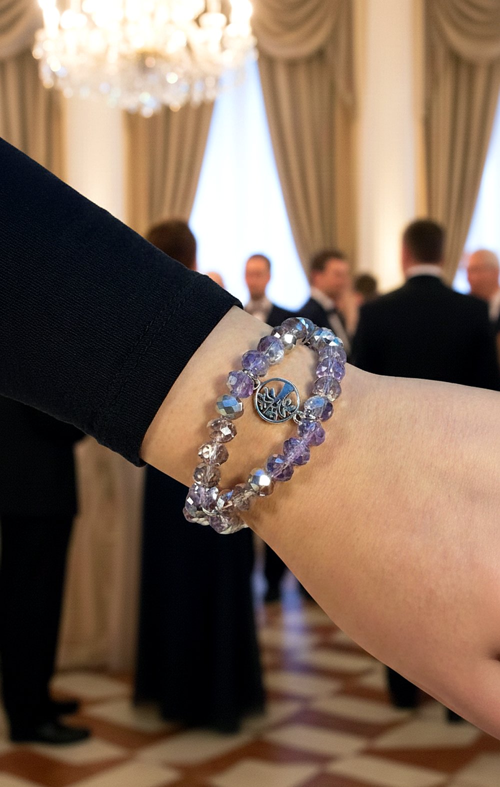 أسوارة مشغولة يدوياً بعناية فائقة من خرز الكريستال البنفسجي المصقول الذي يجمع بين الشفافية واللمعان الساحر وتتوسطها قلادة “شجرة الحياة” الفضية لتمنحك إطلالة ملكية راقية والقطعة مصممة بطبقتين متداخلتين لتضفي حجماً وجمالاً على معصمك في المناسبات السعيدة والسهرات بلمسة أنثوية لافتة تدوم طويلاً. مقدمة لكم من (Maram Bracelet)🌷