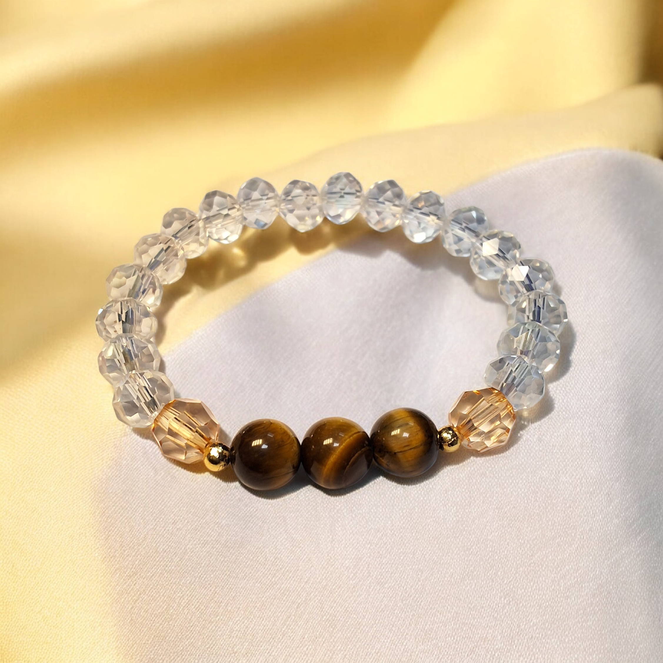 سوار نسائي مصنوع من خرز كريستالي شفاف مع حبات عين النمر في المنتصف ولمسات ذهبية ناعمة، بتصميم متوازن ومناسب للاستخدام اليومي. مقدمة لكم من (Maram Bracelet) 🌷