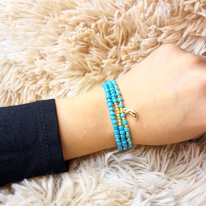 تألقي بإطلالة مبهجة مع هذه الأسوارة اليدوية التي تتميز بثلاث طبقات من خرز الفيروز الصغير يتخللها خرز ذهبي ناعم، وتتوسطها قلادة رقيقة على شكل هلال، لتمنح معصمك مظهراً عصرياً يفيض بالحيوية والجمال. مقدمة لكم من (Maram Bracelet)🌷