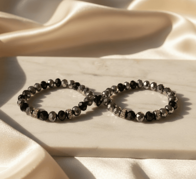 طقم أسوارتين مشغول باليد بعناية، مكوّن من خرز أسود وفضي متعدد القصّات يعكس الضوء بهدوء ويمنح القطعتين توازنًا بصريًا واضحًا. تتوسط الأسوارتين قطعة قلب مغناطيسي تنغلق بانسجام عند التقارب، لتضيف لمسة رمزية تعبّر عن الترابط بأسلوب بسيط وغير مبالغ فيه.