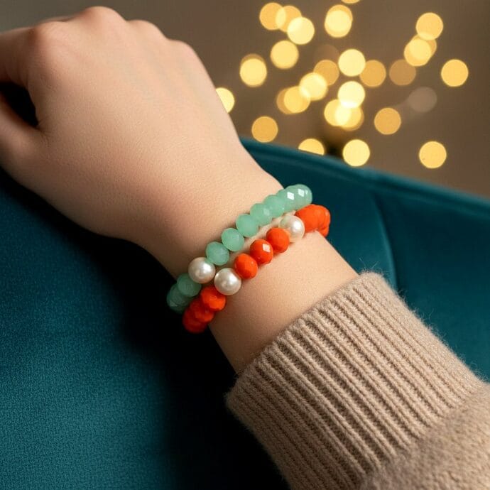 أسوارة مشغولة يدوياً بتصميم مزدوج يجمع بين طبقتين من الكريستال المصقول بألوان متناقضة وجذابة حيث تبرز الطبقة الأولى باللون البرتقالي الدافئ مع حبات اللؤلؤ الأبيض بينما تأتي الطبقة الثانية باللون الأخضر النعناعي الهادئ والقطعة مصممة لتمنح معصمك حيوية فريدة وتناسب إطلالاتك العصرية التي تبحث عن التميز والجرأة بلمسة أنثوية تدوم طويلاً. مقدمة لكم من (Maram Bracelet)🌷