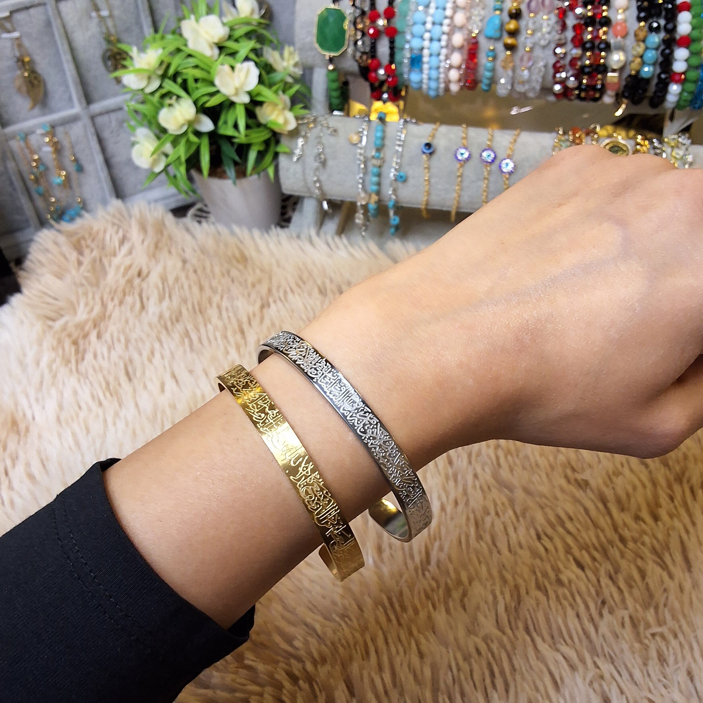 اسوارة عريضة موجودة بلونين الفضي أو الذهبي اللامع بتصميم فاخر يلفت الأنظار، مزينة بنقش آية الكرسي بتفاصيل دقيقة تمنحها طابعًا روحانيًا مميزًا. مصنوعة بخامات عالية الجودة مع ألوان مكفولة تحافظ على بريقها، لتمنحك قطعة أنيقة تدوم وتناسب الإطلالات الراقية بسعر مناسب. مقدمة لكم من (Maram Bracelet)🌷