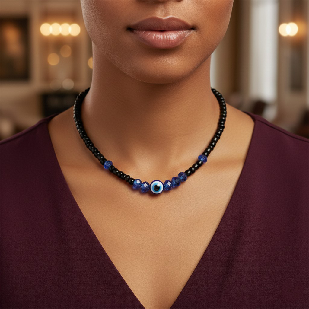 الألوان: خرز أسود لامع، كريستال أزرق متدرج، وخرزة العين الزرقاء.