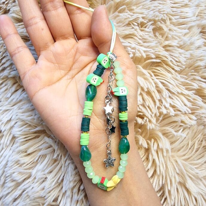 أضيفي لمسة من الحيوية والمرح لمقتنياتك مع هذه الحمالة اليدوية الفريدة، التي تتميز بتصميم مبهج يجمع بين خرز الفينيل الأخضر المتدرج وخرز الكريستال الزيتي اللامع، وتزدان بخرز على شكل حبات تفاح ناعمة ونجوم فضية متدلية. قطعة صُممت لتكون زينة مثالية لهاتفك، حقيبتك، أو سيارتك، لتمنحكِ مظهراً عصرياً يفيض بالطاقة والجمال في كل مكان. مقدمة لكم من (Maram Bracelet)🌷
