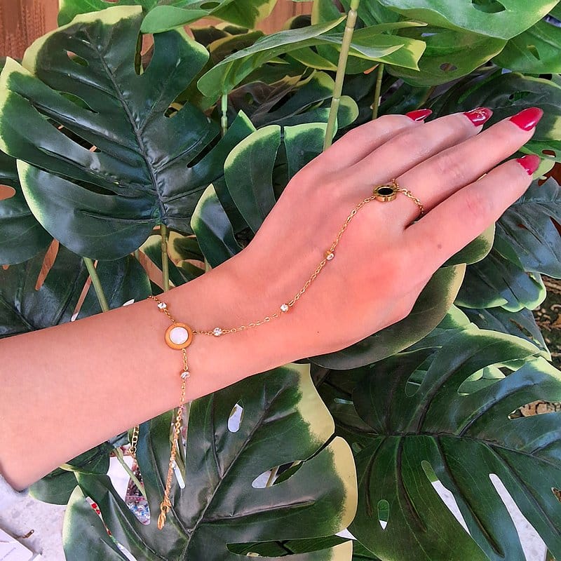 قطعة أنيقة تجمع بين الخاتم والأسوارة بتصميم كف متصل بسلسلة ذهبية ناعمة مزينة بتفاصيل دائرية ولمسات لامعة تضيف طابعاً راقياً وجذاباً. تصميمها الفريد يبرز جمال اليد ويمنحك إطلالة ناعمة ومميزة تناسب الإطلالات اليومية والمناسبات، كما أنها خيار مثالي لهدية أنيقة. مقدمة لكم من (Maram Bracelet)🌷