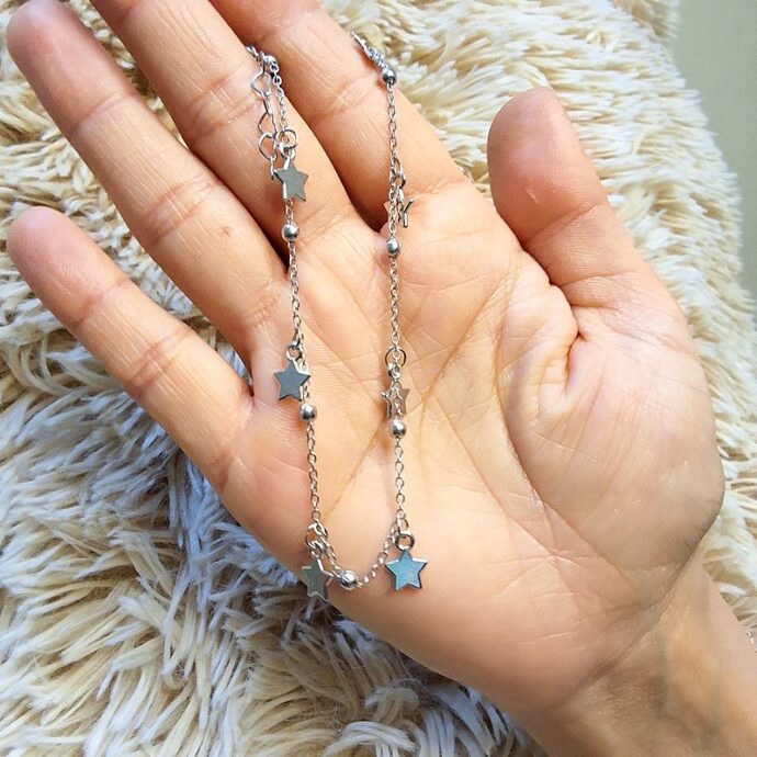 تألقي بجاذبية لافتة مع هذا الخلخال اليدوي الرقيق، الذي يتميز بسلسلة فضية ناعمة تتدلى منها قلادات نجوم مصقولة تتراقص مع كل خطوة. قطعة صُممت لتضفي لمسة من السحر والأنوثة على إطلالتك، مما يجعله الإكسسوار المثالي لإبراز جمال قدمك في جميع مناسباتك. مقدمة لكم من (Maram Bracelet)🌷