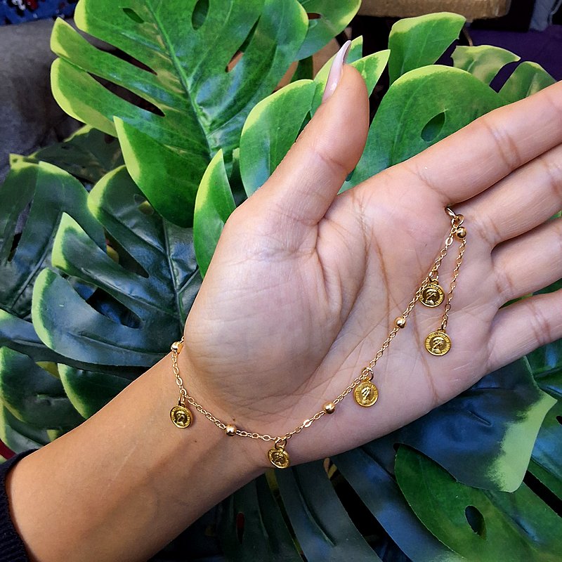 خلخال ذهبي ناعم مزين بتعليقات عملات صغيرة يضفي لمسة أنثوية جذابة على إطلالتك. تصميمه الخفيف والمتحرك يمنح القدم أناقة لافتة تناسب الإطلالات اليومية والمناسبات، كما أنه خيار جميل لهدية مميزة تعبّر عن الذوق الراقي. مشغول باليد بعناية ليمنحك قطعة فريدة. مقدمة لكم من (Maram Bracelet)🌷