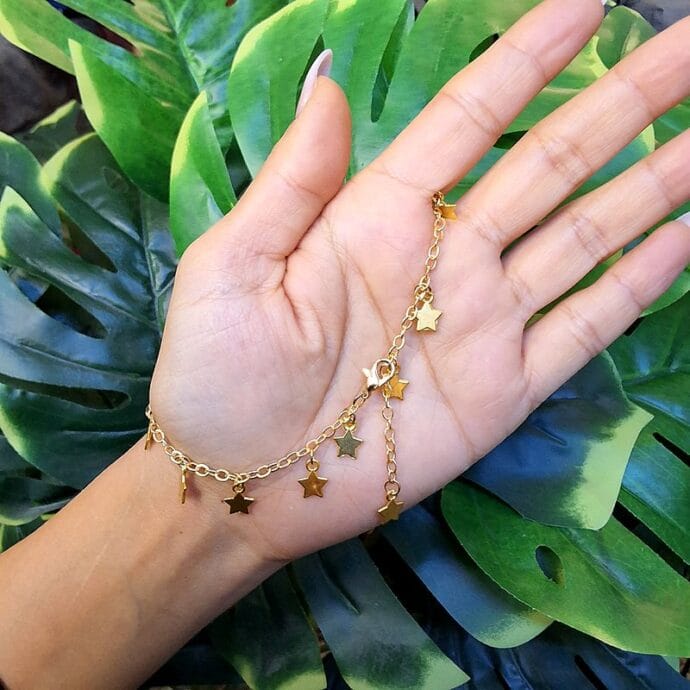 خلخال ذهبي ناعم مزين بتعليقات نجوم متحركة يضيف لمسة أنثوية جذابة وحيوية على إطلالتك. تصميمه الخفيف وتفاصيله اللامعة يمنح القدم أناقة لافتة تناسب الاستخدام اليومي والمناسبات، كما أنه خيار رائع لهدية مميزة تعبّر عن ذوق راقٍ. مشغول باليد بعناية ليمنحك قطعة فريدة. مقدمة لكم من (Maram Bracelet)🌷
