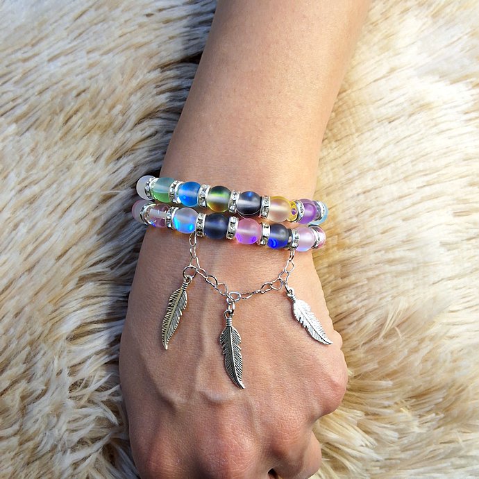 طقم أساور حجر مضيء متعدد الألوان مع تعليقات فضية معتقة ريشةجديد