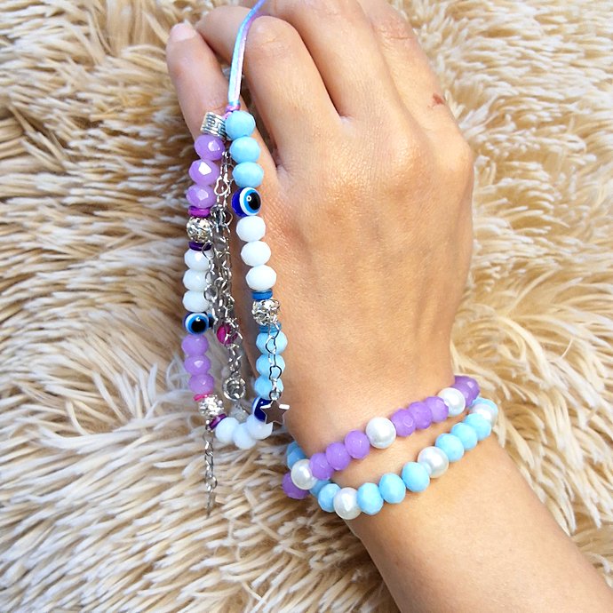 • الطقم مكوّن من قطعتين (أساور) + حمالة موبايل