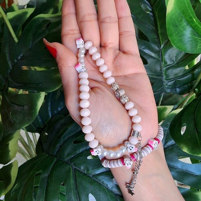 طقم أسوارة مشغولة يدويا من خرز هيشي المسطّح (بوليمر خفيف) بألوان وردية وبيضاء وبيج مع تعليقات صغيرة، بتصميم مرح ومريح للاستخدام اليومي بالإضافة لحمالة موبايل بنفس الأشكال .مقدمة لكم من (Maram Bracelet)🌷تتميّز هذه الأسوارة باستخدام خرز هيشي المسطّح المصنوع من البوليمر الخفيف، والذي يُعرف بوزنه الخفيف وراحته العالية عند الارتداء. ترتيب الأقراص المتناسق يمنح الأسوارة مظهرًا ناعمًا ومتوازنًا، بينما تضيف الألوان الوردية والبيضاء والبيج مع التعليقات الصغيرة طابعًا بناتيًا لطيفًا ومرحًا.قطعة عملية ومريحة، مناسبة للارتداء اليومي، وتضفي لمسة حيوية بسيطة دون تكلّف.فيديو للقطعة (رابط)