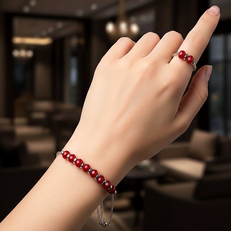 طقم أسوارة وخاتم بخرز كريستالي أحمر دم الغزال وفواصل فضية لامعةجديد