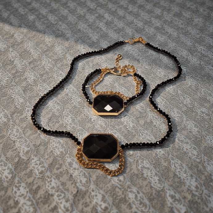 يتكوّن هذا الطقم من أسوارة وطوق بتصميم متطابق يجمع بين الخرز الأسود اللامع وحجر أسود مصقول يتوسط كل قطعة بإطار ذهبي أنيق. السلاسل الذهبية الناعمة تضيف لمسة فخامة متوازنة دون مبالغة، ما يجعل الطقم خيارًا مثاليًا للإطلالات المسائية والمناسبات، ويمكن ارتداء كل قطعة على حدة أو تنسيقهما معًا لإطلالة متكاملة وراقية.