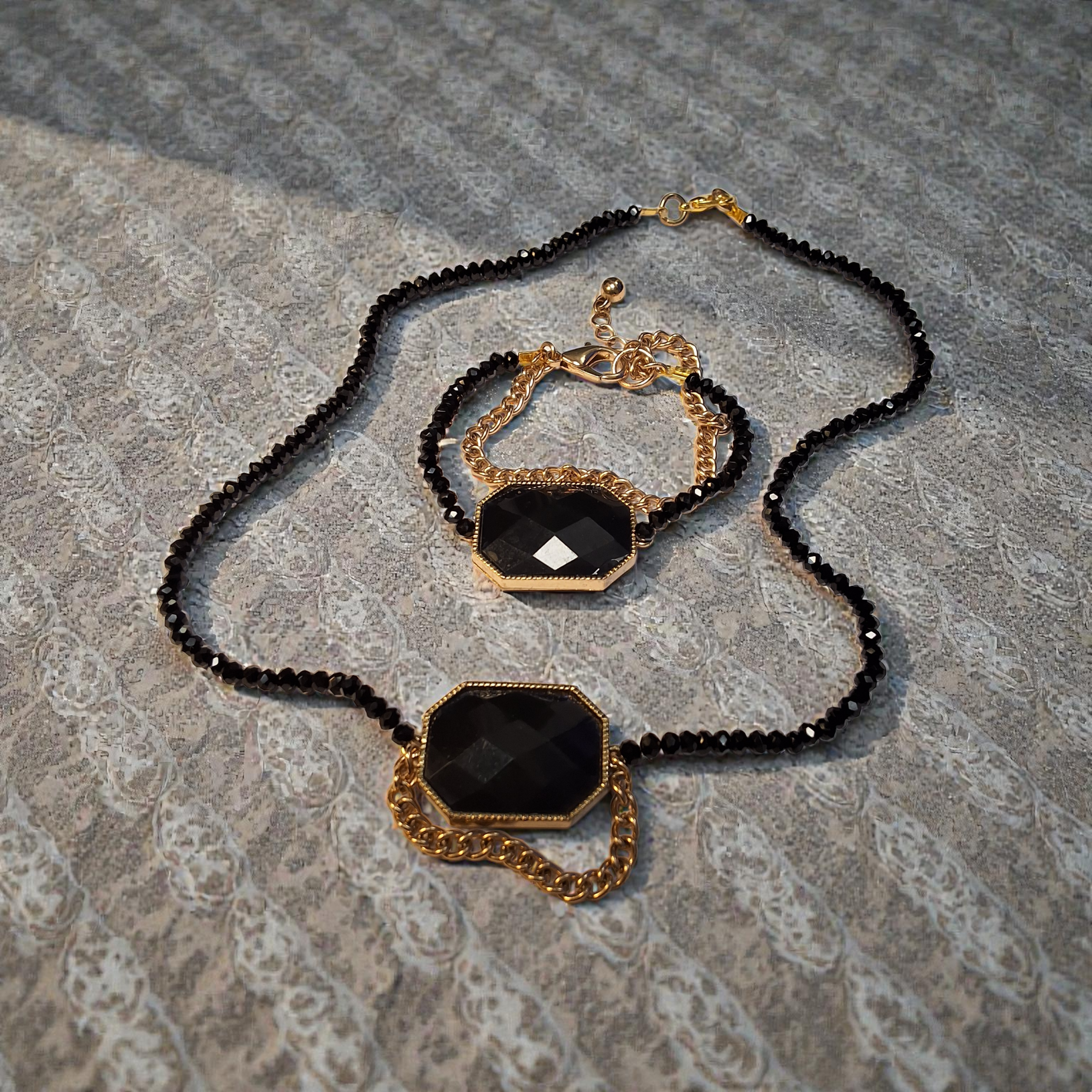 طقم أسوارة وطوق من الخرز الأسود مطعم بالذهبي بأحجار مركزية مضلعةجديد