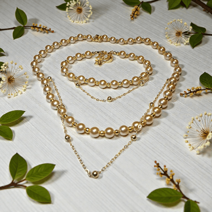 طقم أنثوي ناعم يجمع بين اللؤلؤ اللامع والتفاصيل الذهبية الراقية. تصميم كلاسيك أنيق يضيف لمسة فخامة لإطلالتك اليومية والمناسبات الخاصة، ويعكس ذوقًا راقيًا وبسيطًا. مقدمة لكم من (Maram Bracelet)🌷
