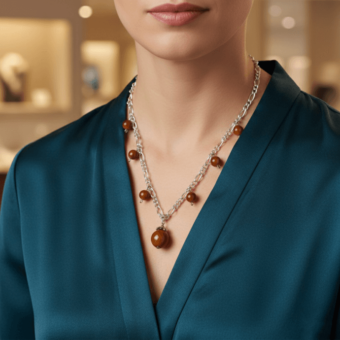 طوق فضي بأحجار بنية دافئة لأناقة بدون مبالغةجديد
