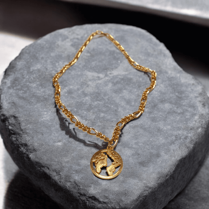 طوق مشغول يدوياً بتصميم ملكي يبرز جمال السلسلة الذهبية بنمط الجنزير اللامع وتتدلى منها قلادة دائرية مفرغة بدقة تمثل خريطة العالم. مقدمة لكم من (Maram Bracelet)🌷القطعة تعبر عن روح المغامرة وحب الاستكشاف مما يجعلها خياراً رائعاً لتقديمها كهدية استثنائية تعبر عن التقدير لتبقى ذكرى غالية تدوم طويلاً.